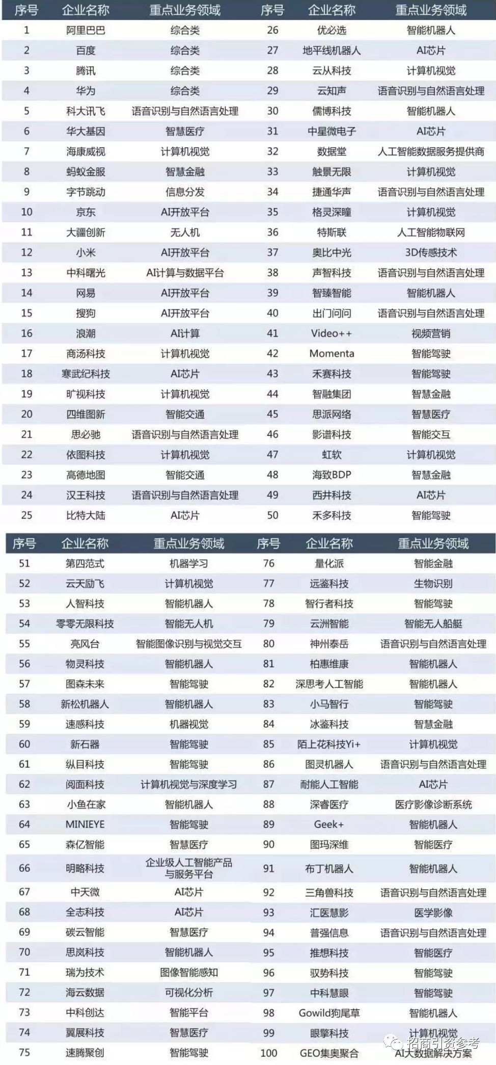 2019人工智能企业综合实力100强名单