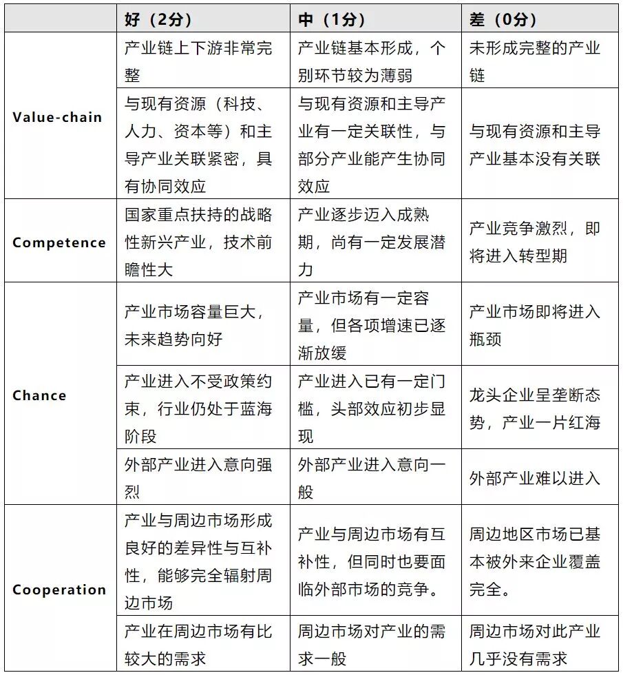 第三步是建立产业评估体系,从产业价值链(Value-chain)和能力(Competence)、机会(Chance)、合作(Cooperation)四个维度出发,对产业发展潜力和发展优势进行评价。