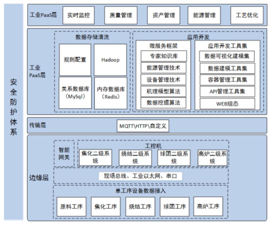 以钢铁行业为例,钢铁行业面临生产过程中高耗能、高排放,对环保限产等压力。此外,人员流动性较高,工艺原理复杂,很难将管理方法和行业知识沉淀下来。因此,基于企业实际需求,构建工业互联网平台,应用系统架构图如图6所示。