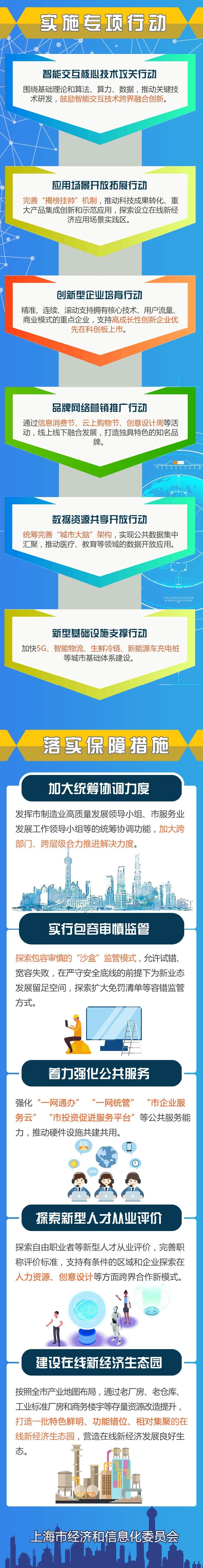 (三)落实5条保障措施。一是发挥市制造业高质量发展领导小组、市服务业发展工作领导小组等的统筹协调功能,加大跨部门、跨层级合力推进解决力度。二是探索包容审慎的“沙盒”监管模式,允许试错、宽容失败,在严守安全底线的前提下为新业态发展留足空间,探索扩大免罚清单等容错监管方式。三是强化“一网通办” “一网统管” “市企业服务云” “市投资促进服务平台”等公共服务能力,推动硬件设施共建共用。四是探索自由职业者等新型人才从业评价,完善职称评价标准,支持有条件的区域和企业探索在人力资源、创意设计等方面跨界合作新模式。五是按照全市产业地图布局,通过老厂房、老仓库、工业标准厂房和商务楼宇等存量资源改造提升,打造一批特色鲜明、功能错位、相对集聚的在线新经济生态园,营造在线新经济发展良好生态。