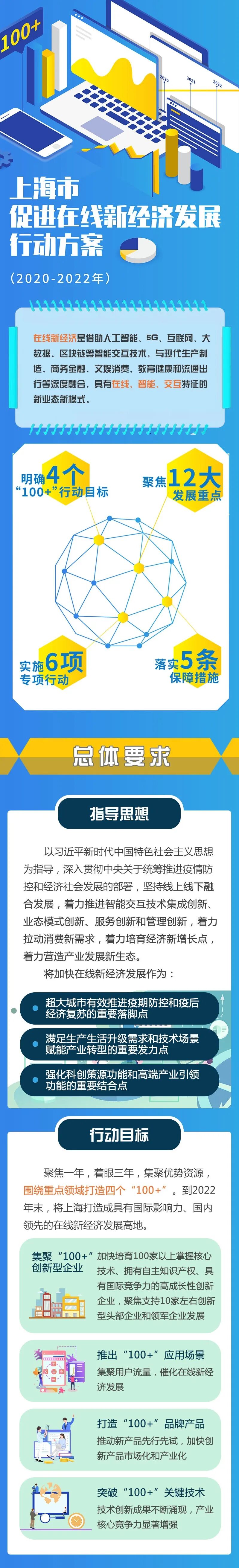 明确4个“100+”行动目标。聚焦一年,着眼三年,集聚“100+”创新型企业,加快培育100家以上掌握核心技术、拥有自主知识产权、具有国际竞争力的高成长性创新企业,聚焦支持10家左右创新型头部企业和领军企业发展;推出“100+”应用场景,集聚用户流量,催化在线新经济发展;打造“100+”品牌产品,推动新产品先行先试,加快创新产品市场化和产业化;突破“100+”关键技术,技术创新成果不断涌现,产业核心竞争力显著增强。到2022年,将上海打造成具有国际影响力、国内领先的在线新经济发展高地。