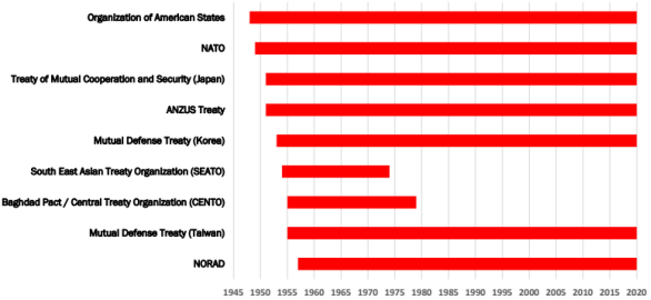 如今,美国的一些冷战联盟不仅幸存了下来,而且发展壮大了。如今,北美防空司令部不仅保护北美免受空中和导弹攻击,还提供海上威胁预警。北约扩大了其成员,并在欧洲以外进行了部署。在2001年9月11日的恐怖袭击之后,澳大利亚和美国的联盟见证了澳大利亚军队为保卫美国而部署的历史逆转。其他的联盟,如SEATO和CENTO,对美国没有什么好处,当成员的利益发生分歧时就消失了。