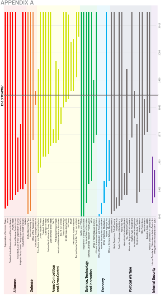 为了更好地了解美国在冷战时期为与苏联竞争而开发的各种工具,CSBA对美国在1945年至1990年间创建的旨在促进美国在与苏联竞争中获取利益的组织和机构进行了清查(见下图)。