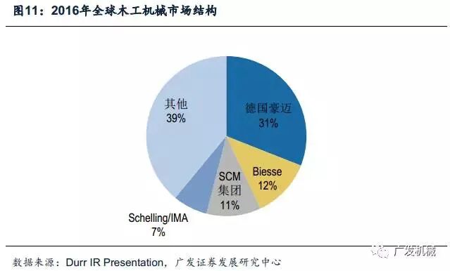 全球木工机械行业中,德国和意大利的龙头企业引领了行业的发展,不管是规模还是技术上,全球木工机械行业基本由德国豪迈、意大利BIESSE等几家大型企业所占据,并且整体格局较为稳定。根据杜尔集团(2014年收购德国豪迈)2017年发布的投资者关系报告,德国豪迈、意大利Biesse、意大利SCM集团占全球木工机械市场的份额分别为31%、12%、11%。而在高端市场中,几家国际大型企业所占份额更高。