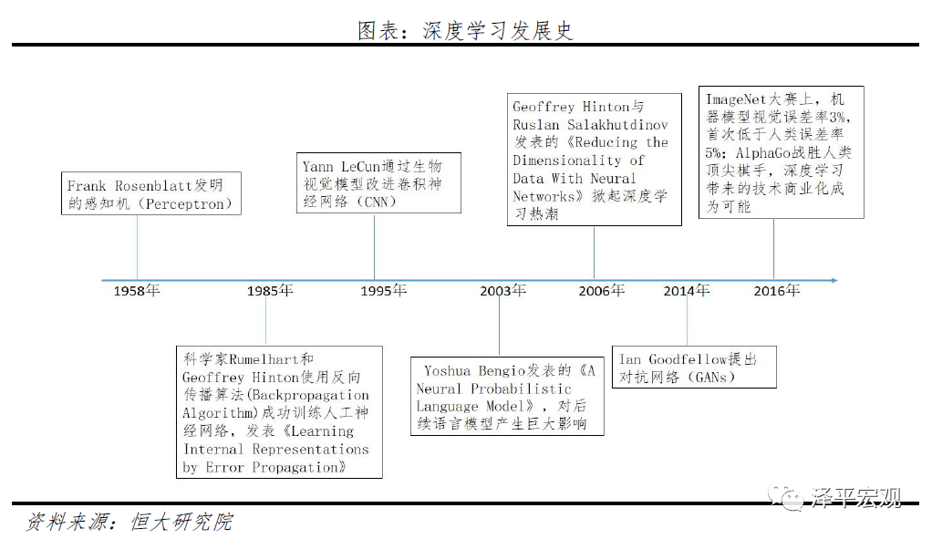 足够多、足够好的数据支撑人工智能“感知”阶段,而人工智能算法使计算机拥有思维,从而达到“理解、决策”,深度学习在这过程作出巨大贡献。深度学习是一类模式分析方法的统称,计算机通过学习样本数据来掌握内在逻辑和规律,从而拥有分析能力,这项研究最早可以追溯到1958年弗兰克·罗森布拉特发明的感知机(Perceptron)。利用感知机,可以进行图像区分训练,例如最常见的从水果堆中选出“苹果”或者“香蕉”。然而当时缺少足量的数据,该项研究陷入瓶颈,并出现过度拟合(Overfitting)问题,例如学生希望通过练习相似的题目来掌握一种题型,但是训练量不够大、并没有理解题型背后的知识点,考试一旦发生些许变化便无法解出答案。后来,科学家通过研究人脑,试图模仿人脑神经网络机制来进行图像、声音等分类工作,逐渐演化成如今的深度学习。