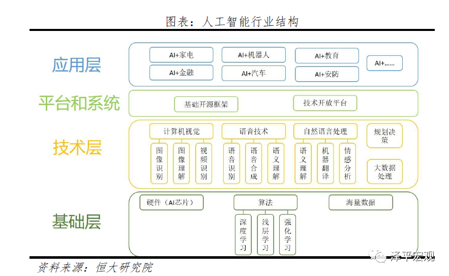 2、“人工智能+”:创造新需求、新商业模式、新的经济增长点。以汽车为例,其中智能网联是人工智能在汽车行业应用最受关注的领域。智能网联一方面可以提升汽车的智能化,包括自动驾驶、智能语音、智能座舱等;另一方面与5G相结合,提高汽车信息沟通能力,实现网联化,包括人员和车辆安全管理、城市道路交通规划等。1)汽车将成为各种服务和应用的入口,催生新的商业模式:智能网联汽车可以在生命周期内通过OTA空中升级持续更新应用,界面交互将赋予汽车更多应用场景——在无人驾驶的情况下,司机将有更多的自由时间,而车联网技术使汽车随时与办公室、家、公共设施相联,实现远程控制。与智能手机行业发展类似,随着智能网联汽车发展成熟,数据增值(包括共享出行、汽车保险、金融服务)、娱乐休闲、智能规划等应用环节的重要性和产业价值将超过单纯的汽车生产和制造环节。2)汽车电子、汽车软件等需求提升:汽车电子和软件对汽车的重要性提高,自动驾驶、计算平台、车载操作系统等前沿技术成为新的价值增长点。