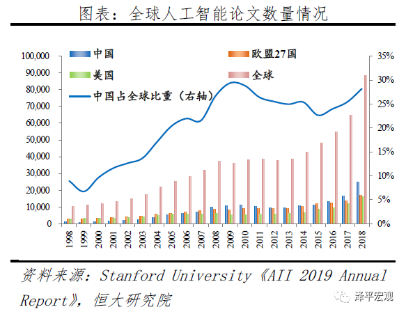 中国人工智能领域论文数量增长较快,但论文质量与美国依然存在差距。全球累计共发布人工智能论文超70万篇,中国、美国是论文发表大国,2018年中美两国分别发布论文2.5万篇和1.6万篇,全球合计占比46.5%。从增长趋势来看,美国保持匀速增长,中国自2014年后增长较快,中国论文数量占全球总量比重从1998年的8.9%上升为2018年的28.2%。从代表论文质量的FWCI指数(平均加权引用影响指数)来看,中国论文质量也在稳步提升,从1998年的0.43提升至2018年的1.39。美国保持全球最高水平,长年保持在2左右,2018年FWCI指数达2.38。