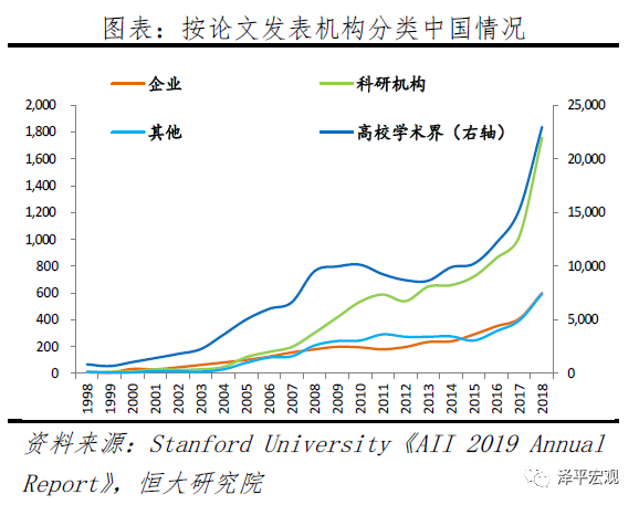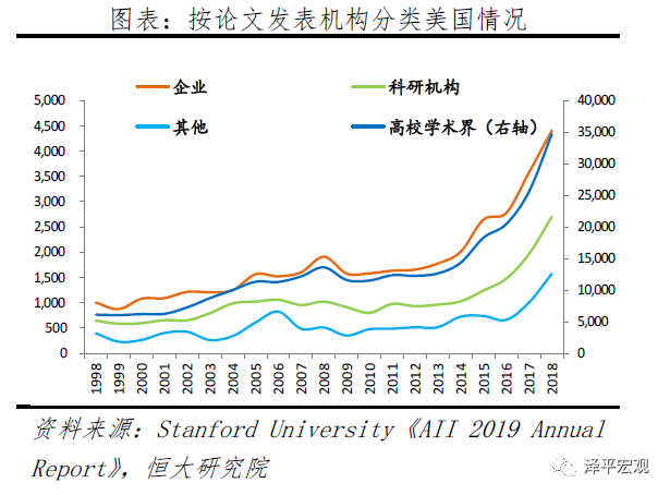 从论文发表机构类型来看,包括中国、美国、欧盟27国等在内的各国和地区均以高校为核心科研力量,2018年三者高校论文产出占各自总产出的92.1%、84.6%、90.7%。除高校外,中美两国的主力科研主体有所不同,2018年中国科研机构产出约为中国企业产出的3倍,而同期美国企业产出约为美国科研机构产出的1.6倍。