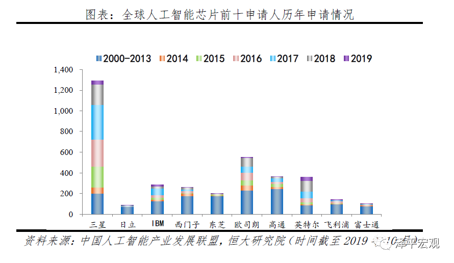 人工智能芯片的出现显著提高数据处理速度,支撑日益复杂的算法处理庞杂数据,是人工智能发展的重要基础。随着处理的数据量增多、从通用场景到各类特定场景,算法模型设计的框架和层数也越来越复杂,这对基础硬件提出更高的运算要求。从相关专利申请情况来看,中美两国是申请大国,截至2019年10月,中美两国人工智能芯片专利申请量分别为1.6万项和1.1万项。从相关申请人来看,传统芯片和半导体企业更有优势,其中三星、日立和IBM是该领域的前三专利申请人,从近年申请趋势来看,三星和英特尔表现更积极。从实际应用产品来看,目前具备代表性包括英特尔EyeQ系列、英伟达Xavier系列、华为昇腾310、寒武纪Cambricon 1M系列、百度昆仑芯片等。