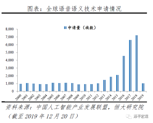 深度学习的发展推动人工智能基础应用技术突破,自2010年起,全球包括计算机视觉、语音语义等基础应用技术的专利申请量急速增长。