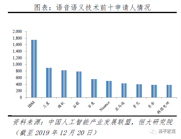 语音语义技术主要是让计算机学会“听、读”文字、段落、文章等,经常用于文字识别、语音情感分析、人机对话、声音定位等,适用于翻译软件、车载操作系统、智能音箱、语音助手等领域。从语音语义技术相关的技术申请情况来看,截至2019年12月20日,全球共申请4.3万项专利族,中美两国依然是这个领域的主要申请国,合计占比超过75%。从申请人来看,语音语义领域的申请人以企业为主,其中IBM、三星、微软为前三申请人,申请专利量分别为1741项、890项、821项。从专利授权人来看,微软、IBM、Nuance为前三授权人,授权量分别为672项、468项、440项。从国内企业情况来看,百度成为唯一一家在语音语义技术领域申请量和授权量均列全球前十的企业。