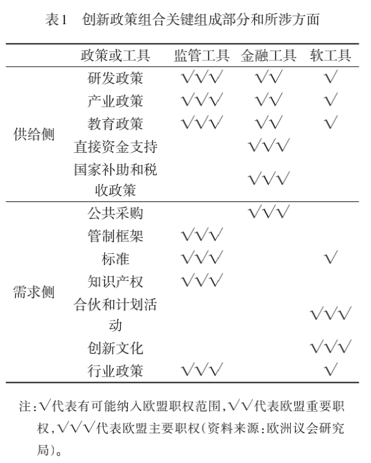 欧盟创新政策组合既包括针对创新行为主体的关键政策,也包括主要的框架条件。围绕创新主体相关的运作和组织方式,主要涉及研发政策、产业政策、教育政策和区域政策;主要框架条件涵盖了影响创新主体之间活动的政策和工具,例如金融工具、监管工具和软工具。有些政策和手段是支持创新的有利条件(即“供给侧”的政策和工具),另一些政策和手段则有助于创新的需求(即“需求侧”政策和工具)。