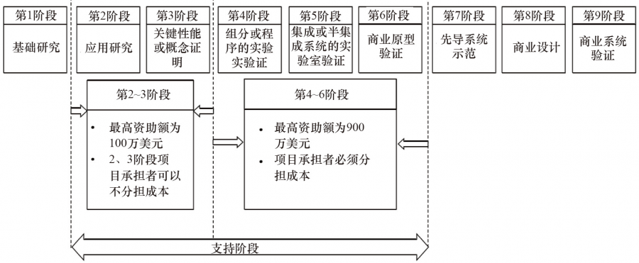 以美国创造性制造计划(innovative manufacturing initiative,IMI)中 PPP 的运用为例,IMI 计划把技术从产生到实现商业化的过程分为9个阶段实施管理,并且对不同阶段项目成本的分担具有明确规定。