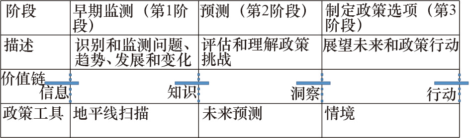 以英国地平线扫描为例,英国政府构建了一套系统化的信息检验方法,确认潜在的威胁、风险、机遇与挑战,从而在相关领域做好更充分的准备,并纳入政策制定的过程。英国地平线扫描主要针对以下3种类型的政府活动:战略发展、政策制定、测试分析。