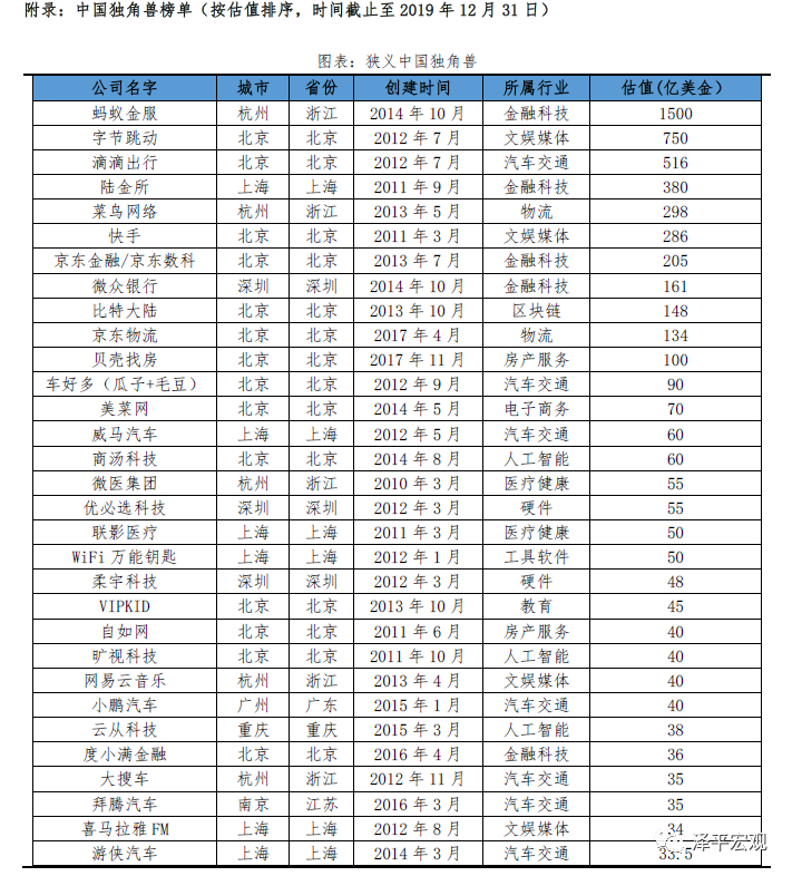 注:广义独角兽即成立时间不限,狭义需不超过十年。在选择对象时,我们主要考察以下4点:1)企业产品或者提供的服务的核心价值;2)企业产品或者提供的服务的流量价值;3)企业产品或者提供的服务所能带动的辐射价值;4)商业模式价值。在测算估值时,由于独角兽未上市且大部分为互联网企业,主要采取乘数估值法(包括市盈率与市销率)、可比公司法、融资投资法(详情参考《中国独角兽报告:2019》)。