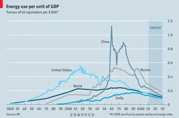 中外单位GDP能耗对比,来源:BP