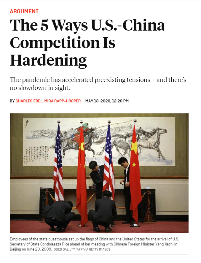 2020年5月18日,美国“外交政策”网站发布题为《中美竞争加剧的五种方式》文章,认为中美均已将对方看作主要竞争对手,并正在军事、经济、科技、国际秩序及信息五大关键领域开展竞争,而新冠疫情将进一步加剧双方对抗。同时,美国白宫于5月20日发布《美国对华战略方针》报告,从中国对美国的挑战、应对途径和贯彻落实三个方面,阐述在《国家安全战略》指导下美国对华开展战略竞争的思路,其内容也印证上述趋势。因此,清晰理解中美竞争缘由,明确中美未来战略竞争要地,对预测中美战略竞争发展趋势具有切实帮助。