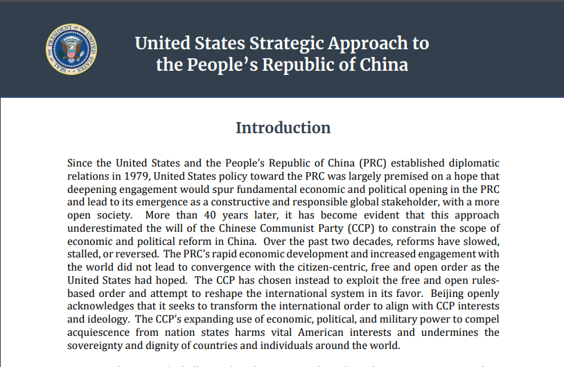 美国在《美国对华战略方针》报告中指出,自中美建交以来,美国希望深化接触使中国变成一个更加开放的国家。但在近40年的发展中,中国并未建立起以公民为中心、自由和开放的秩序,反而正在试图重塑国际秩序,并在经济、价值观和国家安全观三个方面对美国构成挑战。