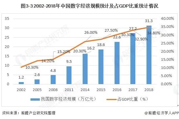 2017年中国数字经济规模达27.2万亿元,同比增长20.3%,占GDP的比重达到32.9%。截止至2018年我国数字经济规模达到31.3万亿元,按可比口径计算,名义增长20.9%,占GDP比重为34.8%,占比同比提升1.9个百分点。