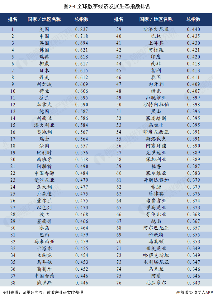 根据《2018年全球数字经济发展指数》(阿里研究院)报告,其中,全球数字经济发展指数排名中国以0.718的指数成绩位列全球第二,数字经济发展程度较高。