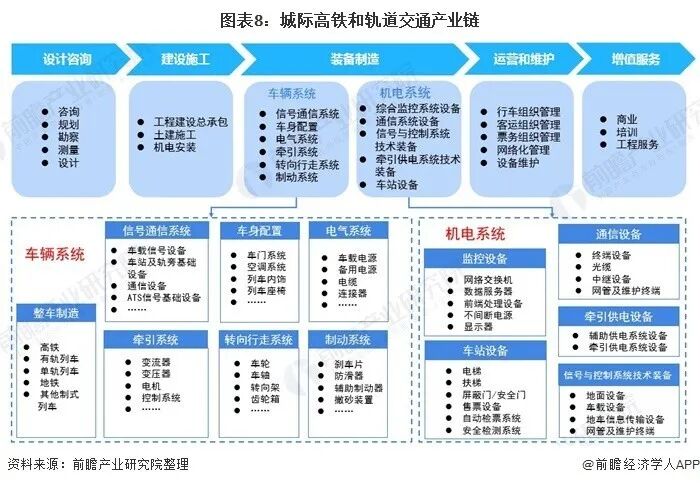 设计咨询是工程开工前期的设计和可行性咨询环节,包括咨询、规划、勘察、测量和设计等域;工程建设指轨道交通项目施工环节,可分为工程建设总承包、土建施工和机电安装,安装机电包括通信、信号、牵引供电和电力供电系统,即“四电集成”工程;装备制造主要指轨道交通的车辆系统和机电系统的制造,涉及机械制造、电子信息、高分子材料等多个领域:运营维护及增值服务,包括轨道交通传统的运营管理和物业、广告、媒体商业、资源开发等行业。
