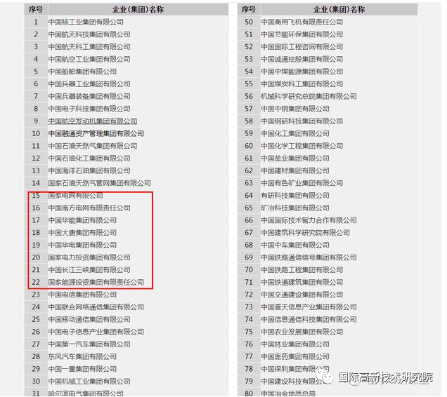 中国核工业集团有限公司中国航天科技集团有限公司中国航天科工集团有限公司中国航空工业集团有限公司中国船舶集团有限公司中国兵器工业集团有限公司中国兵器装备集团有限公司中国电子科技集团有限公司中国航空发动机集团有限公司中国融通资产管理集团有限公司中国石油天然气集团有限公司中国石油化工集团有限公司中国海洋石油集团有限公司国家石油天然气管网集团有限公司国家电网有限公司中国南方电网有限责任公司中国华能集团有限公司中国大唐集团有限公司中国华电集团有限公司国家电力投资集团有限公司中国长江三峡集团有限公司国家能源投资集团有限责任公司中国电信集团有限公司中国联合网络通信集团有限公司中国移动通信集团有限公司中国电子信息产业集团有限公司中国第一汽车集团有限公司东风汽车集团有限公司中国一重集团有限公司中国机械工业集团有限公司哈尔滨电气集团有限公司中国东方电气集团有限公司鞍钢集团有限公司中国宝武钢铁集团有限公司中国铝业集团有限公司中国远洋海运集团有限公司中国航空集团有限公司中国东方航空集团有限公司中国南方航空集团有限公司中国中化集团有限公司中粮集团有限公司中国五矿集团有限公司中国通用技术(集团)控股有限责任公司中国建筑集团有限公司中国储备粮管理集团有限公司国家开发投资集团有限公司招商局集团有限公司华润(集团)有限公司中国旅游集团有限公司[香港中旅(集团)有限公司]