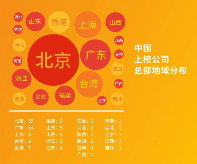 北京55家,广东14家,上海9家,香港7家,福建5家,山东、山西、浙江5家、江苏4家、安徽、河北、陕西、新疆2家,甘肃、广西、河南、湖北、辽宁、江西、吉林1家。