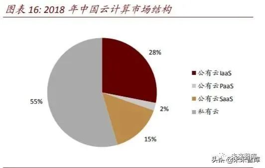结构:中国云市场 IaaS 占比较高,美国主导的全球云市场则以 SaaS 为主。根据信通院数 据,2018 年中国公有云市场中 IaaS 占比约 62%:公有云 SaaS 占比仅为 33%;全球公有云 市场情况则较为不同,公有云中 SaaS 占比最高约 64%,IaaS 和 PaaS 分别占比 24%和 12%。我们认为,我国云计算结构以 IaaS 为主的主要原因是国内 IT 支出以硬件及设备为主,软件 付费习惯依然有待养成。