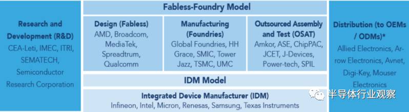 也许最重要一点在于,供应链的全球化催生了半导体行业中各种各样的商业模式。在半导体行业初期(可追溯到1950年代和1960年代),半导体行业主要由集成设备制造商(IDM)组成,即在内部进行半导体制造(尤其是设计和制造)所有关键环节的公司。英飞凌,英特尔,美光,瑞萨,三星,SK Hynix和德州仪器软件仍然是领先的IDM厂商。