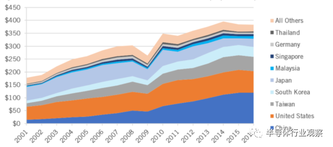 图3:2001年和2016年全球半导体产业增值的各国(或地区)份额