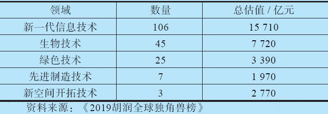 1.2.3 新一轮科技革命带来发展新红利当前新一轮科技革命和产业变革正处在实现重大突破的历史关口,全球科技创新进入空前密集活跃的时期,前沿技术呈现集中突破态势,多个技术群相互支撑,全面涌现的链式发展局面正在形成。众多颠覆性创新呈现几何级渗透扩散,引领战略性新兴产业众多领域实现加速发展,并以革命性方式对传统产业产生全面冲击。中国科学院白春礼院士将当前的主要技术进展归纳为信息科技、生命健康、能源、新材料、先进制造、深空深海深地探测六个方面。而从具体产业发展的角度,全球独角兽企业可以视为一个观察新产业、新技术突破的窗口。 表1.2 2019 年全球技术驱动独角兽概况