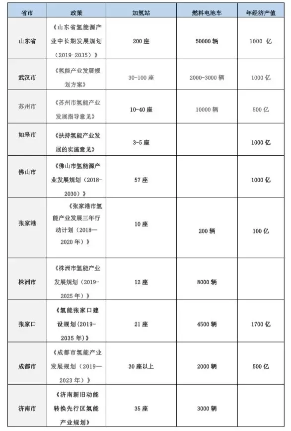 2019年6月,山东省发布《山东省氢能源产业中长期发展规划(2019-2035)》。规划提出,到 2025 年,全省氢能源产业增加值达到1000亿元,燃料电池固定式发电装机容量达到3200MW,燃料电池汽车应用规模达到 50000 辆,加氢站数量达到 200座。到 2035 年,规模质量效益进一步提升,实现高质量稳健发展。
