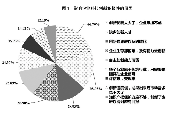 “代差”指两代技术产品在科技含量、产品性能、产品质量、生产效率等方面的差别。基础研究是科学创新源头,其薄弱会限制原始创新能力,导致关键核心技术“卡脖子”。通过调研企业技术水平,发现在同行业中“处于国际领先”“处于国内领先”的企业分别为一成、四成,且集中在通用或专用设备,汽车制造,计算机、通信设备制造业,以及电力、燃气及水生产供应行业。尽管近年来企业更加注重核心技术攻关和基础研发,如六成企业将独立开发与研制作为主要方向,五成选择与高校或科研机构合作开发,但基础研究不可预测、时间长、风险高,需投入巨大人力、物力、财力等。2020年中、美、日基础研究经费中企业执行占比分别为6.5%、32%、47%,基础研究资金支撑不足导致企业基础研究不活跃,与科技创新主体的地位不匹配。调研中,企业很少关注基础研究(图1),其中“创新花费太大了,企业承担不起”是首要原因(47%),其次是创新人才少(38%)。北京一家集成电路设计企业技术开发经理表示,突破发达国家长期技术积淀形成的体系化技术壁垒是从事基础研发的重要使命,囿于国内技术积累不足需向国外缴纳高额专利费,企业烧了很多钱,目前资金缺口较大,延缓了创新步伐。