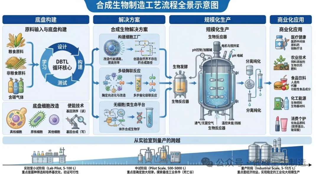 这幅全景图不仅是一个静态的技术流程图,更动态地揭示了合成生物制造的内在逻辑:它以DBTL循环为方法论核心,以多元化原料和工程化底盘为基础,提供了从活体细胞到无细胞系统的多路径解决方案,并通过严苛的规模化工程放大,最终将“设计生命”的能力转化为赋能各行各业的实际产品。底部跨越“死亡谷”的产业化路径则警示我们,从一篇顶级论文到一个成功的商品之间,横亘着漫长而艰巨的工程化、商业化征程。这张图精准地捕捉了合成生物学作为“平台型”颠覆技术,从实验室走向产业、从单点突破走向系统集成的宏伟画卷。