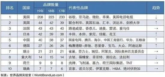 表 2019年《世界品牌500强》入选数最多的国家前10