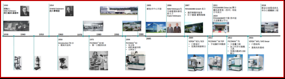 公司产品以钻铣功能的立式和门式加工中心为主,产品品种少而精,充分考虑了行业和用户需求,关键零部件(主轴、自动化控制系统等)自行设计和装配以保证持续的技术迭代,充足的备品备件以保证最好的售后服务以及最短的交货期,家庭内部良好的传承机制(第三代)以保证长期战略的一致性,相对保守的理念避免公司的大起大落。公司大约200员工,研发人员20余人。公司除了为20名左右的技校学生提供实习机会外,还积极参与技校实验设施和课程的建设。2018年公司销售额约为 8000万欧元,人均产值40万欧元。产品的连续性从图1的公司发展历程可以看得出来,九十年的专注才铸造了公司今天的行业地位。