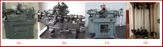 (a) 旧的Tornos自动车床, (b) 旧的Petermann车床,(c). 旧的Bechler车床, (d) 1905年产的Bechler 车床(蒸汽驱动)(来源于李泽湘文章)