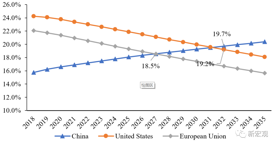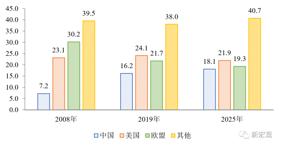 预计“十四五”期间,世界经济总体上呈现中国份额明显提高、美国相对稳定、欧盟显著下降的格局(见图1),中、美、欧经济占比将分别达到18.1%、21.9%和19.3%。