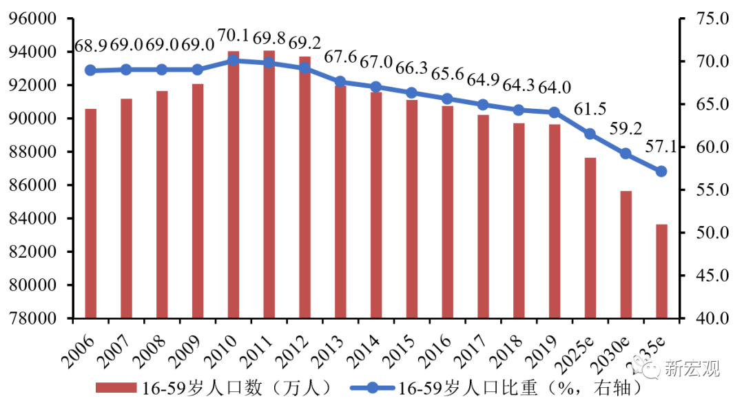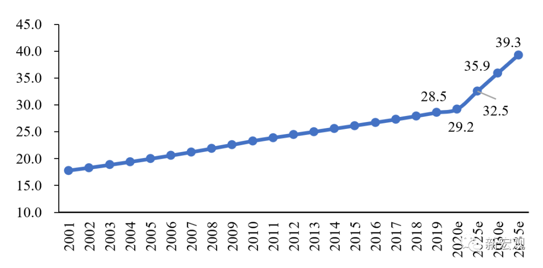 老龄化进入加速期,劳动力供给将继续下降。到2025年,预计我国60岁以上人口占比将达到20.5%,65岁以上人口占比将接近14.0%,劳动年龄人口将继续减少2000万人左右,比重下降至61.5%(见图7)。