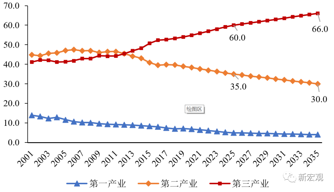 “十四五”时期,预计二产比重将由2019年的39%下降至35%左右,三产比重将持续提升至60%左右(见图6)。在数字化带动下,制造和服务加快融合,个性化、定制化、智能化生产将逐渐成为主体形态。
