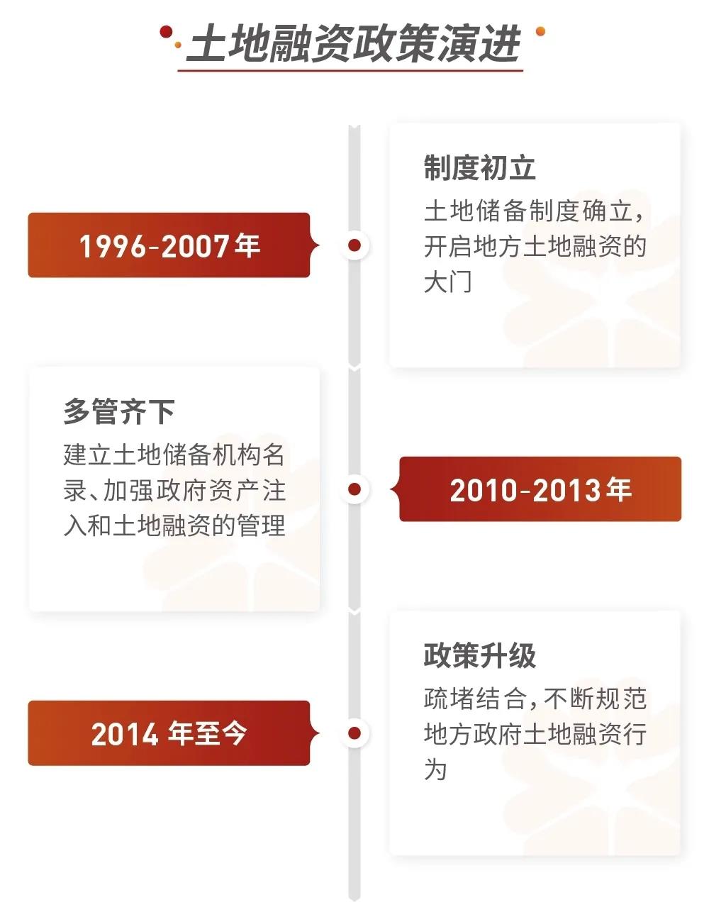 一、第一阶段(1996~2007年):制度初立——土地储备制度确立,开启地方土地融资的大门 1996年,在土地市场存在多头供地、总量失衡、方式不规范等背景下,上海率先在全国建立土地储备制度,开展城市土地储备的探索和实践,上海市土地发展中心作为我国第一家土地储备机构应运而生。 2001年4月,国务院发布《关于加强国有土地资产管理的通知》(国发[2001]15号,以下简称“《通知》”)首次提出,为增强政府对土地市场的调控能力,有条件的地方政府要对建设用地试行收购储备制度,并禁止以协议方式出让经营性用地,将城市的经营性用地纳入市场轨道。同年6月,国土资源部为贯彻落实国务院《通知》,下发了《关于整顿和规范土地市场秩序的通知》(国土资发[2001]174号),也提出城市政府要对存量土地试行储备收购的要求。 2007年2月,财政部、国土资源部发布的《土地储备资金财务管理暂行办法》(财综[2007]17号)提出,土地储备机构可以按照国家有关规定举借银行贷款及其他金融机构贷款。 2007年12月,国土资源部、财政部、中国人民银行联合发布的《土地储备管理办法》(国土资发[2007]277号,以下简称“《办法》”)是我国第一部规范土地储备工作的全国性法规,其正式发布实施标志着我国土地储备制度初步确立。《办法》一是明确土地储备的含义,即市、县人民政府国土资源管理部门为实现调控土地市场、促进土地资源合理利用目标,依法取得土地,进行前期开发、储存以备供应土地的行为;二是明确储备工作的实施主体,必须由土地储备机构承担;三是土地储备机构向银行等金融机构申请的贷款应为担保贷款,其中抵押贷款必须具有合法的土地使用证。