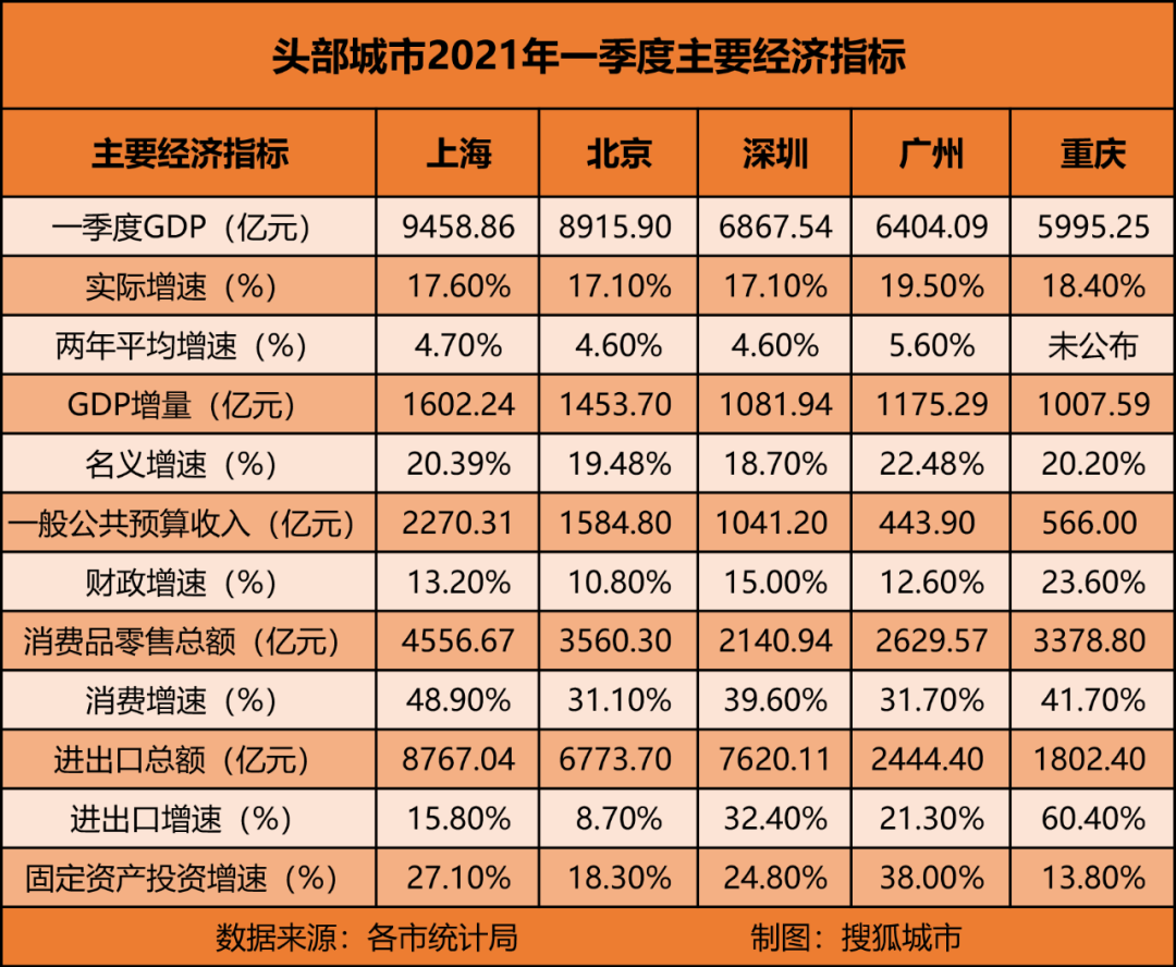一季度,GDP三强城市——上海、北京、深圳的经济运行步调十分一致,同比增速均为17%左右,两年平均增速约为4.6%,名义增速都在19%上下。