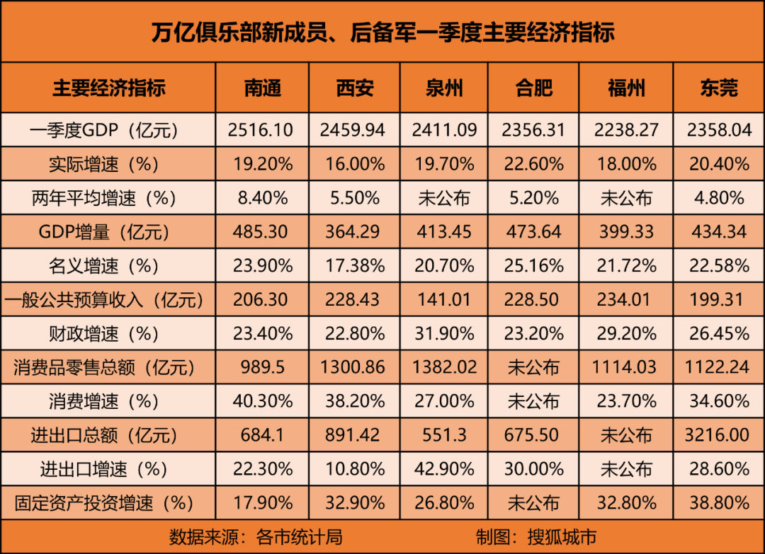 去年,万亿俱乐部迎来最大扩容,泉州、济南、合肥、南通、西安和福州6个城市集体晋级。今年一季度,这些城市的位次有了明显调整。