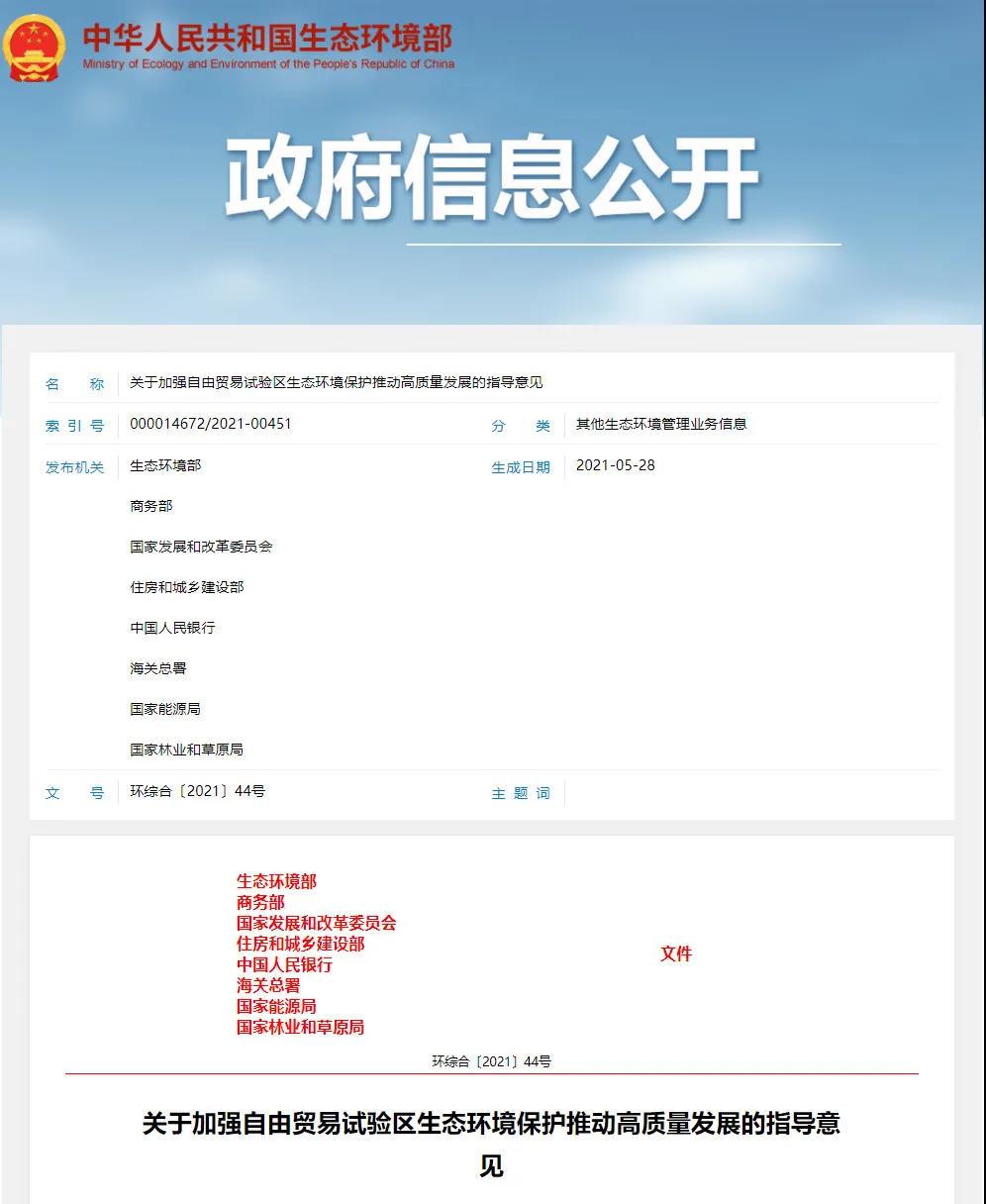 国家发改委、国家能源局、生态环境部、商务部、住房和城乡建设部、中国人民银行、海关总署、国家林业和草原局近日联合发布《关于加强自由贸易试验区生态环境保护推动高质量发展的指导意见》。