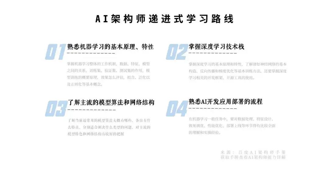 要先熟悉机器学习的基本原理、再掌握相关技术栈、结合算法模型与网络结构、熟悉AI开发应用部署的流程这是一个渐进的过程,不能期望一蹴而就。作为企业的技术架构师最好先成为AI技术专家再进行业务的落地,结合项目实践不断迭代深入。