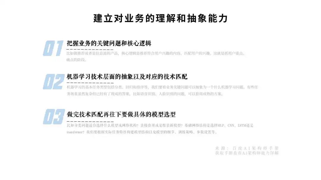 AI架构师尤其需要重视理解业务的诉求和逻辑,只有抓住业务问题的关键点,才能够做出正确的抽象设计和技术选型,切忌只从AI技术出发去理解业务。从业务的关键问题和核心逻辑开始,掌握在机器学习技术层面的抽象以及对应技术匹配,做完技术匹配再往下做具体的模型选择。