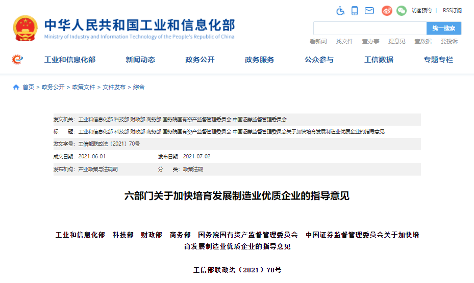 近日,工业和信息化部、科技部、财政部、商务部、国资委、证监会联合发布《关于加快培育发展制造业优质企业的指导意见》(工信部联政法〔2021〕70号,下称《指导意见》),现就《指导意见》有关内容解读如下: