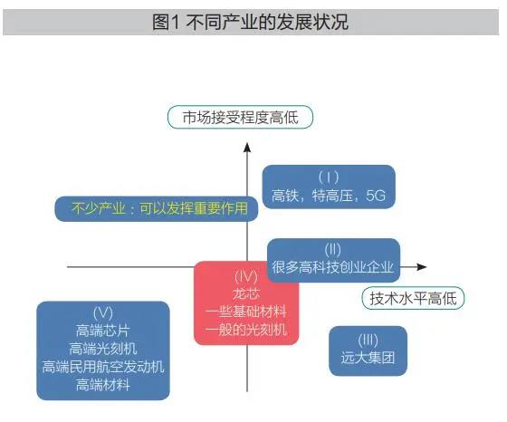 这5种类型的情况是不一样的:情况(I)表明,在这类产业里,实现科技自立自强、建立以本土企业为主导的创新体系已经取得巨大成绩;情况(II)则表明,在这类产业里,建立以本土企业为主导的创新体系已经取得突破,未来潜力巨大,但是还有非常长的路要走;情况(III)则表明,这类产业已经有了比较坚实的技术基础,但是市场开拓还有待突破,建立以本土企业为主导的创新体系还处于非常艰难的探索阶段;情况(IV)看起来类似于情况(III),但是有很大的不同,比情况(III)面临的困难更大,因为技术有待进一步提高;至于情况(V),挑战性非常大,需要在技术和市场上实现双突破, 但是也有有利条件,即容易取得共识,这不同于情况(IV)。
