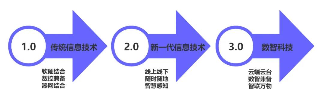 以数智科技为代表的新一代信息技术的创新和应用,不仅加速了信息产业的发展,还加快了信息化与工业化的融合发展,更孕育出以数字经济为代表的新经济。1.0的传统信息技术更多地是软硬结合、数控兼备、器网结合,2.0的新一代信息技术强调线上线下、随时随地、智慧感知,3.0的数智科技强调云端云台、数智兼备、智能感应、智联万物。
