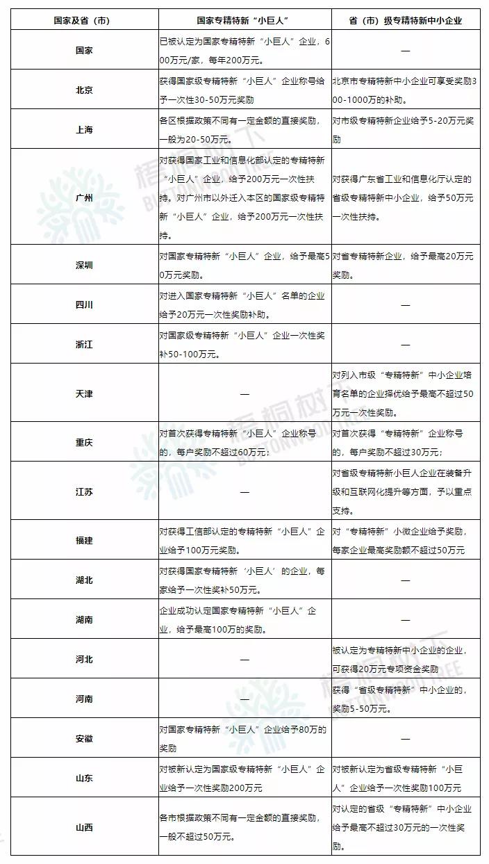 表1:国家及部分省(市)对专精特新企业的奖励标准
